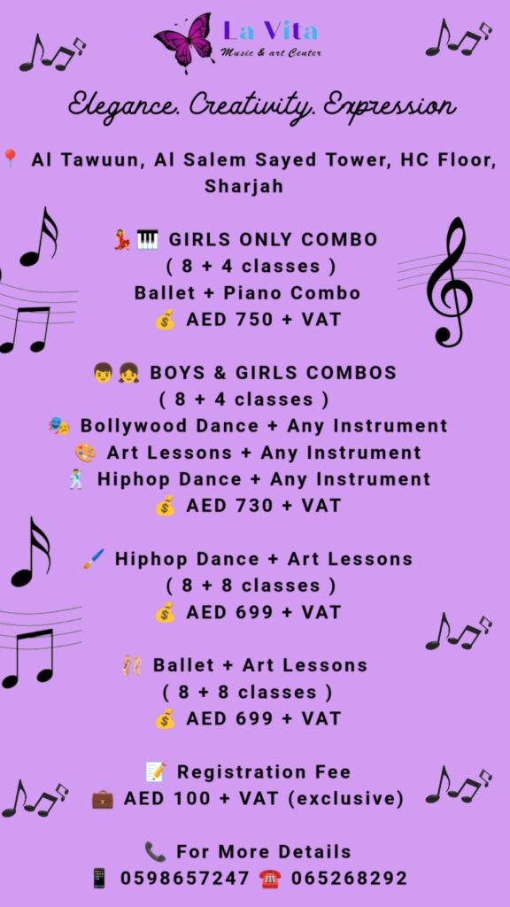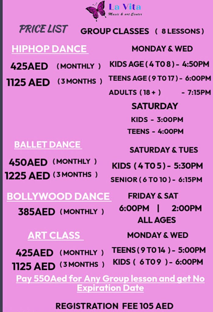 Ballet, Hip-Hop, Aerobic, Bollywood, Theory of music, Art & Craft , Singing And Games (all subjects included in a one package)